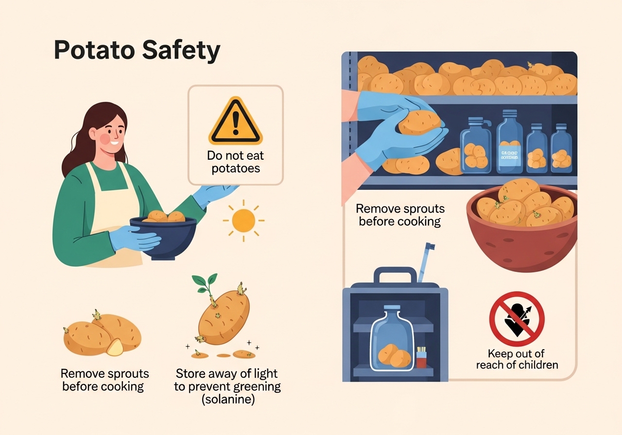 | 녹색 감자 및 싹 제거 | 햇빛에 노출되어 초록색으로 변한 감자나 싹이 난 감자는 솔라닌 함량이 높습니다. 싹은 도려내고, 초록색 부분은 두껍게 벗겨내야 합니다. 심한 경우 섭취하지 않는 것이 안전합니다. |