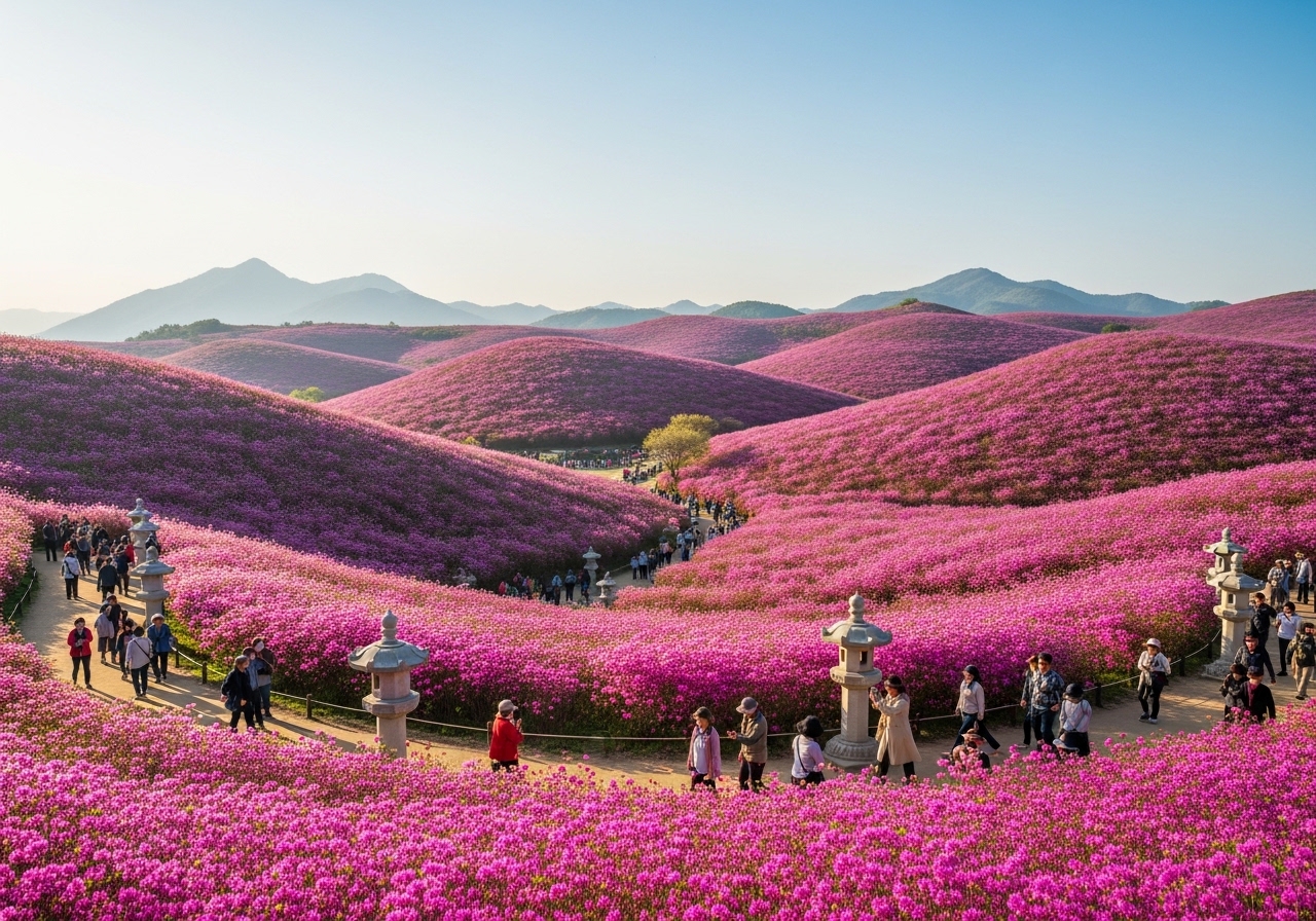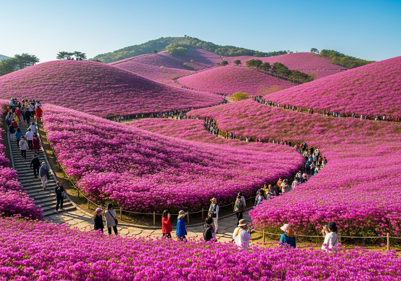 제가 직접 방문해보니, 현재(2026년 4월 15일 수요일) 축제 5일차로 진달래가 절정을 향해 가고 있답니다. 평년보다 개화가 조금 앞당겨져 4월 10일 전후로 만개하기 시작했고, 지금도 그 화려함을 유지하고 있어요. 특히 이번 주말에는 약 80% 이상의 진달래가 활짝 피어 가장 아름다운 모습을 볼 수 있을 것으로 예상됩니다. 놓치지 마시고 꼭 방문해보시길 추천해요!