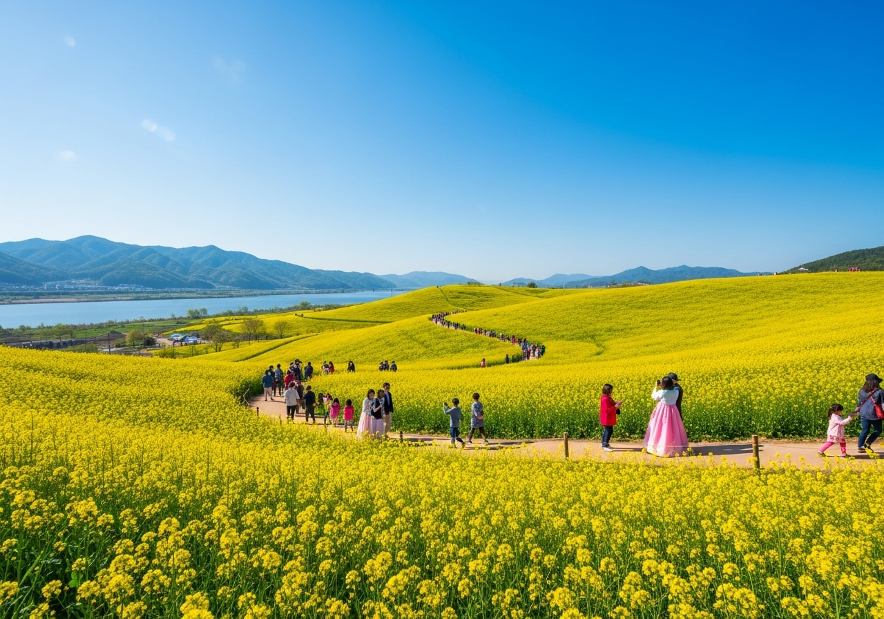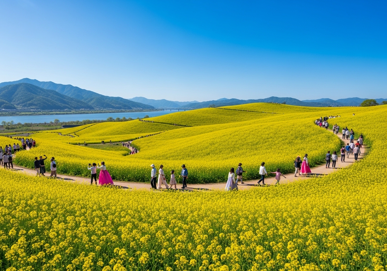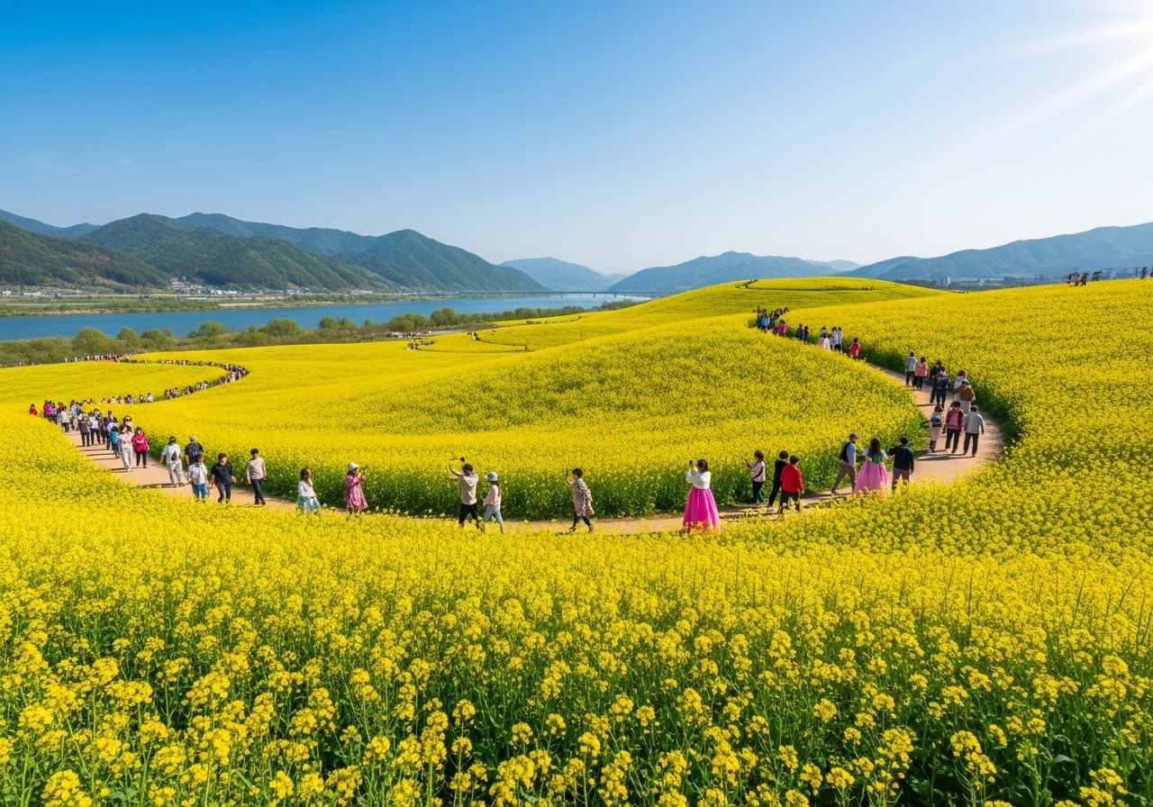 창녕 낙동강 유채꽃 축제가 특별한 이유는 바로 그 압도적인 규모에 있습니다. 110만㎡에 달하는 광활한 유채꽃밭은 마치 끝없이 펼쳐진 노란색 바다 같아요. 낙동강 변을 따라 길게 이어진 유채꽃밭은 강변 제방과 어우러져 그림 같은 풍경을 선사합니다. 저는 특히 해 질 녘 노을빛에 물든 유채꽃밭이 너무나 아름다웠어요. 이런 풍경은 오직 창녕에서만 만끽할 수 있는 최고의 봄 풍경이라고 생각합니다.