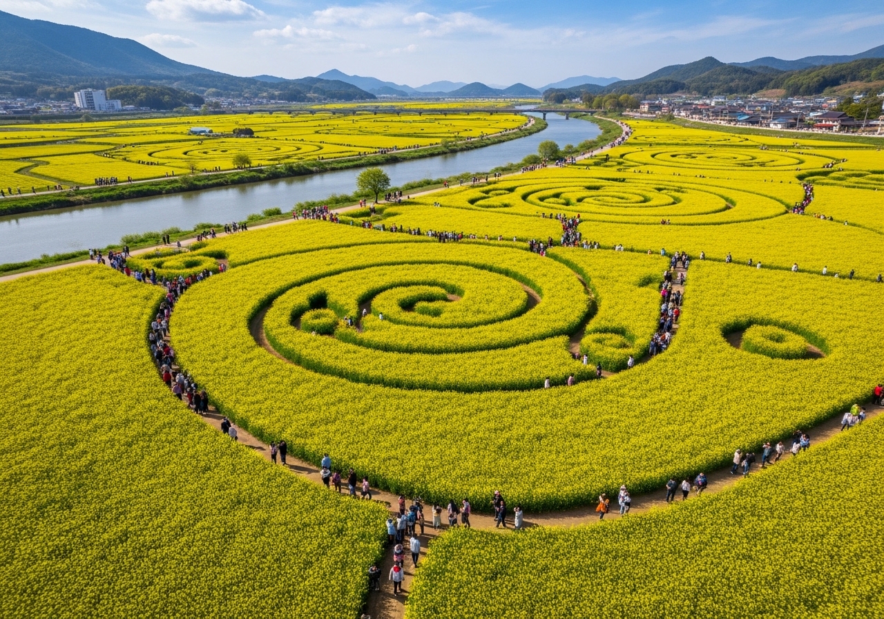 이 축제는 단순히 유채꽃만 보는 행사가 아니에요. 낙동강 남지읍 강변 저지대에 펼쳐진 110만㎡(약 33만 평)에 달하는 국내 최대 단일 유채꽃 단지는 축구장 150개 면적에 비견될 만큼 압도적인 규모를 자랑합니다.