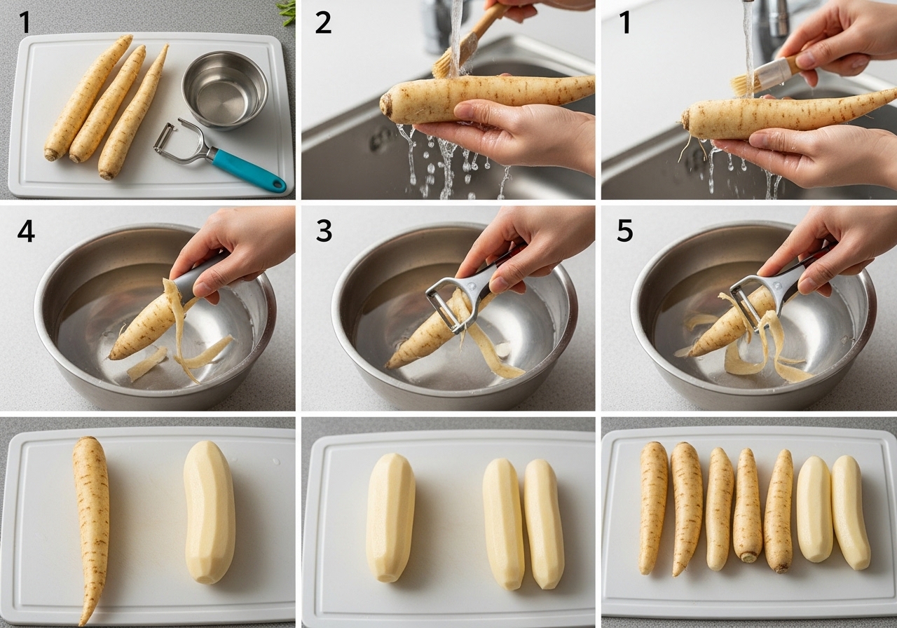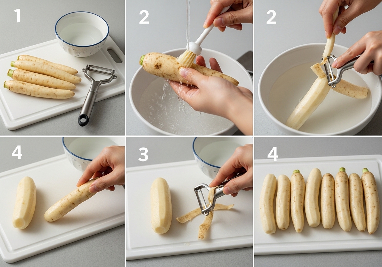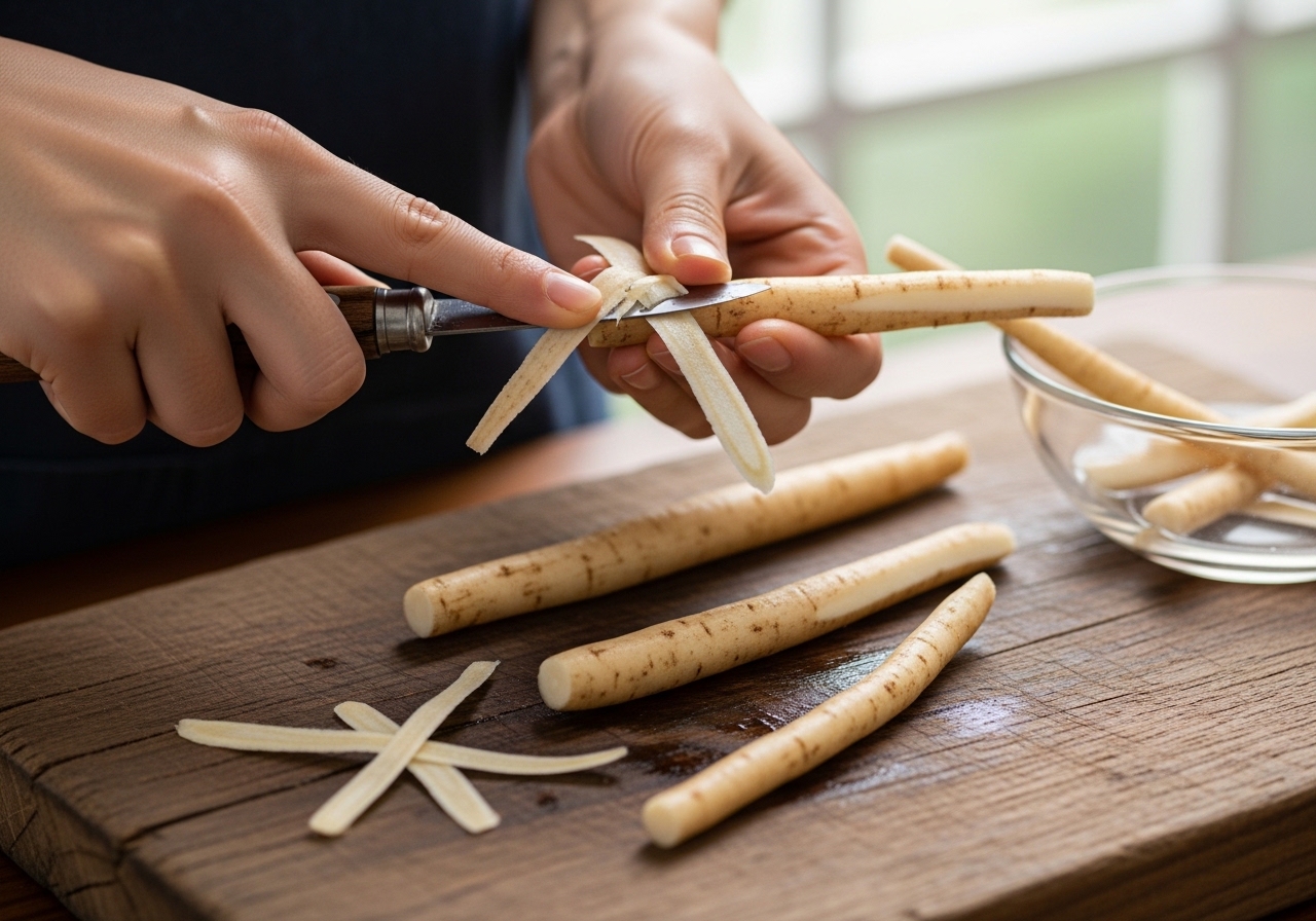 • 껍질 벗기기: 고무장갑을 끼고 더덕을 물에 담근 채로 칼이나 감자칼을 이용해 껍질을 벗깁니다. 물속에서 벗기면 진액이 물에 희석되어 끈적임을 줄일 수 있습니다.