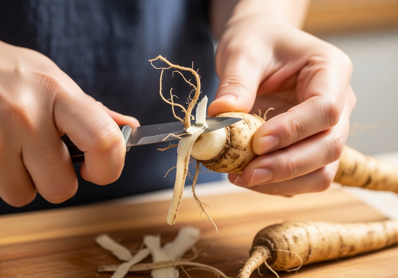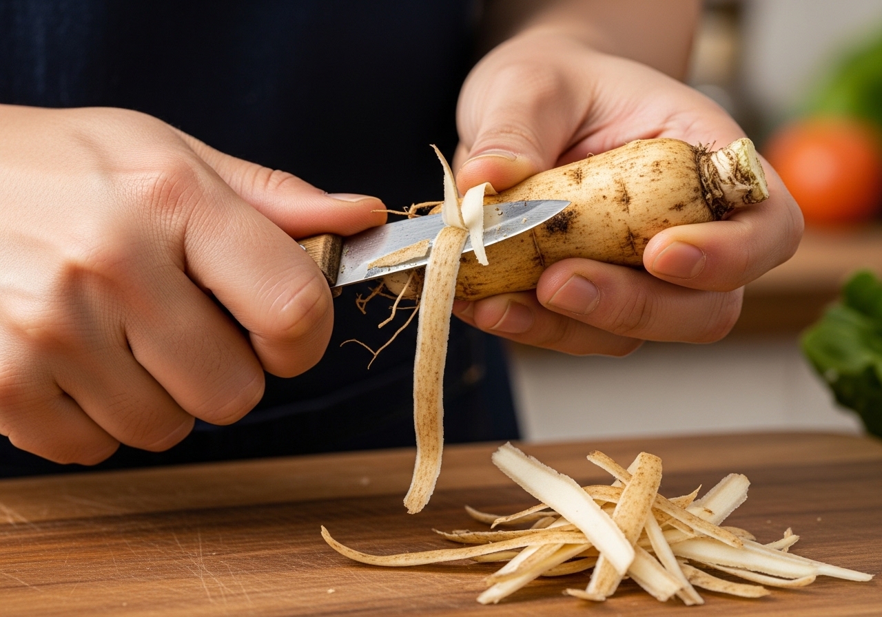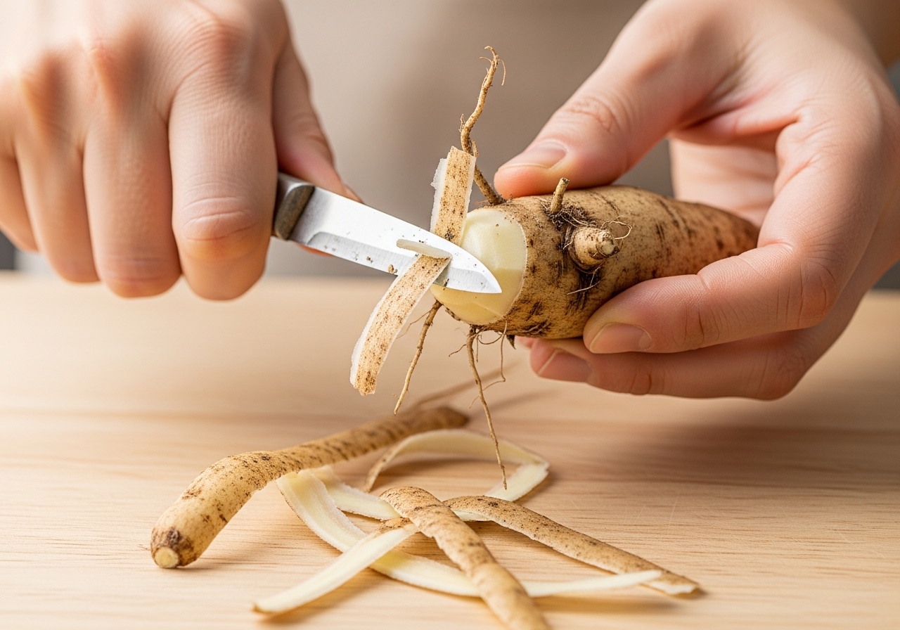 • 껍질 벗기기: 살짝 따뜻해진 더덕을 고무장갑 낀 손으로 잡고 칼이나 감자칼로 벗기면 껍질이 부드러워져 쉽게 제거됩니다.