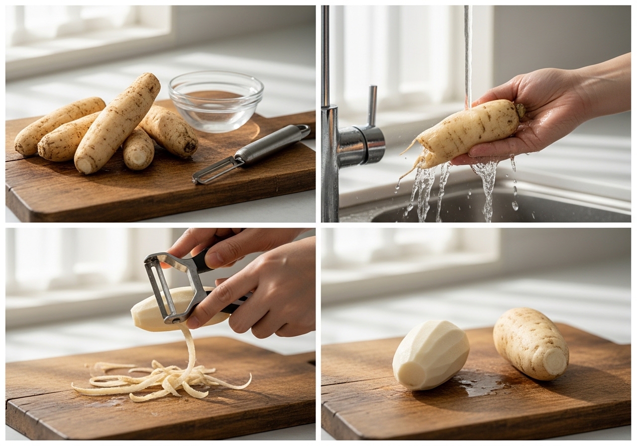 • 세척: 더덕을 흐르는 물에 깨끗이 씻어 흙과 이물질을 제거합니다. 뿌리 부분의 흙은 솔로 살살 문질러주세요.