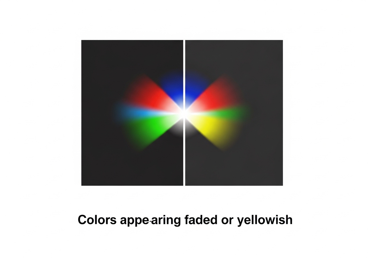 | 색상 변화 | 색상이 희미하거나 노란색으로 보임 | 색상 구별 어려움, 시각적 질 저하 |