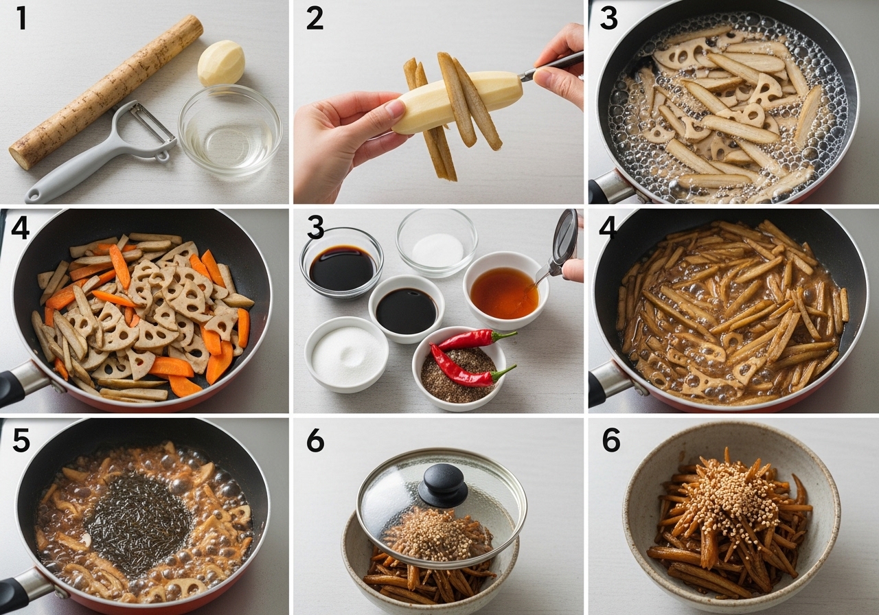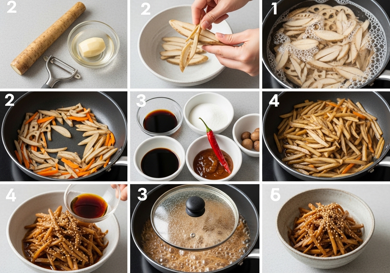 자, 이제 위에서 준비한 재료들로 맛있는 우엉채조림을 만들어 볼 시간입니다. 단계별로 차근차근 따라오세요!