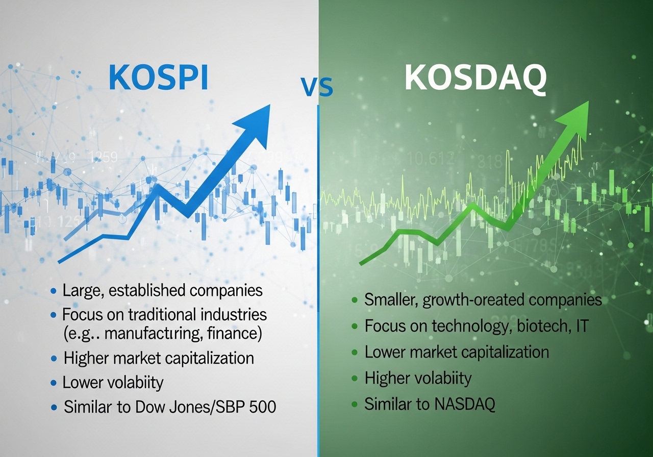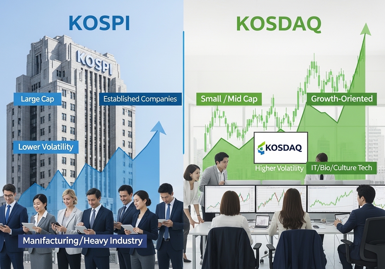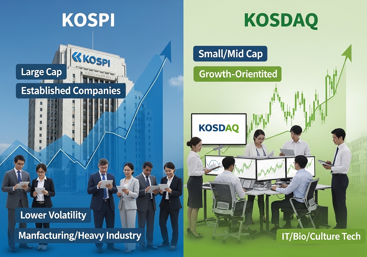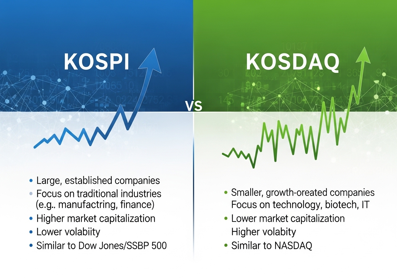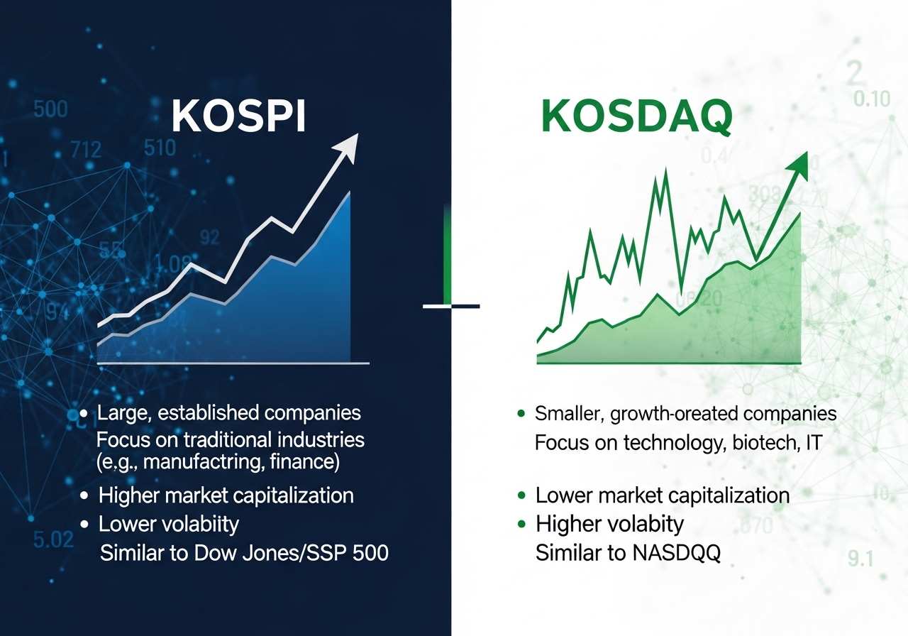 • 코스닥: 벤처/중소/고성장 기업 중심, 높은 변동성, 단기/성장 투자 적합.