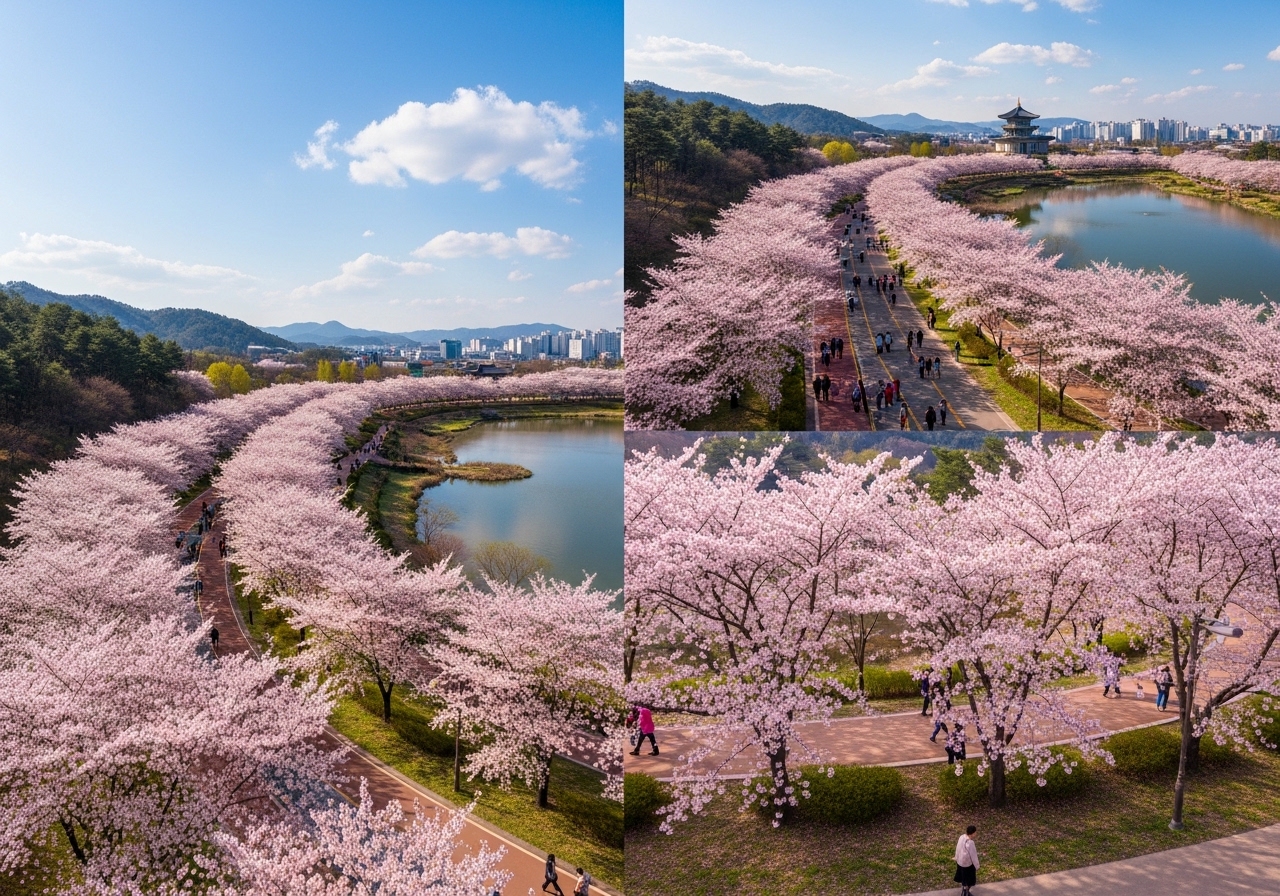 | 천호지 벚꽃길 | 호수를 따라 늘어선 벚나무, 야경이 아름다움 | 낮에는 산책, 밤에는 조명과 어우러진 환상적인 벚꽃길. |
