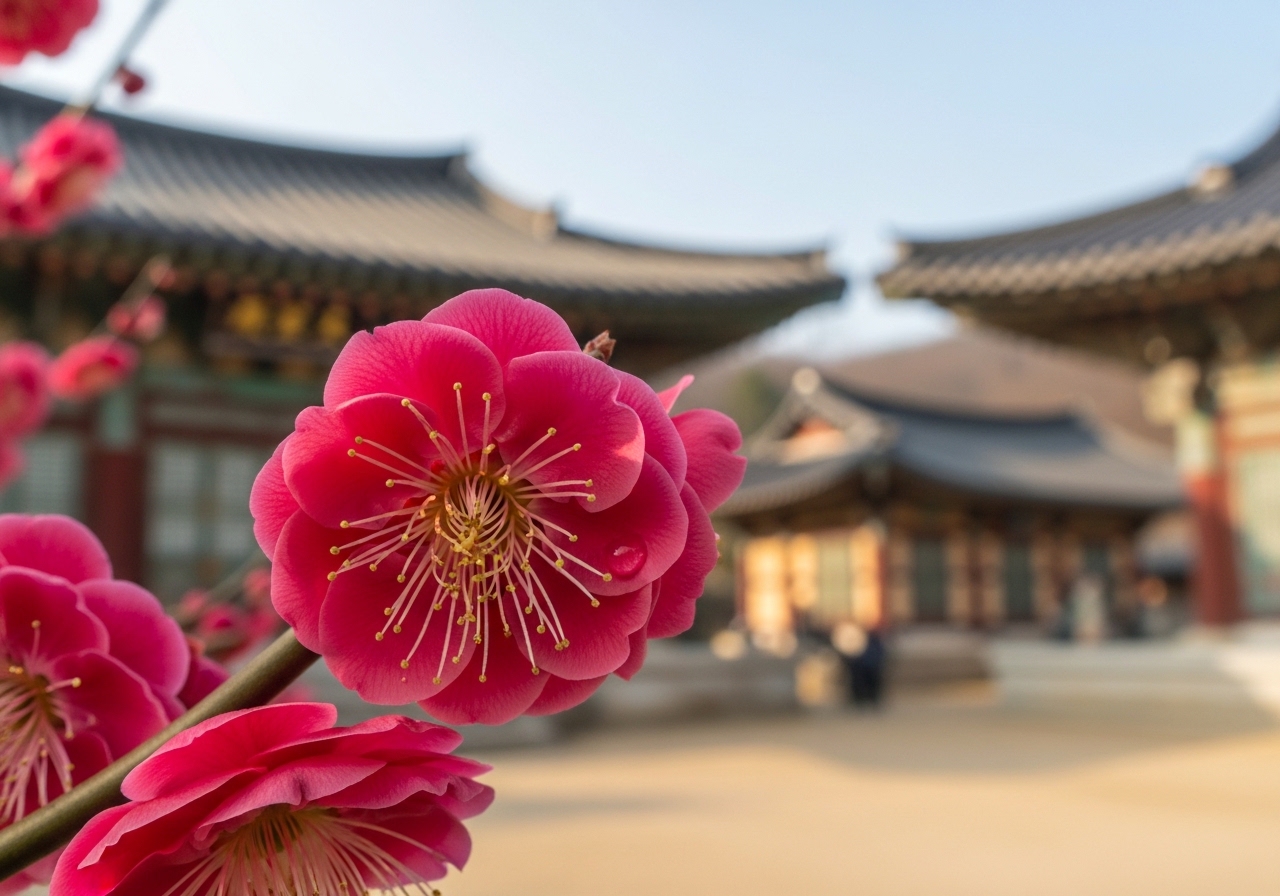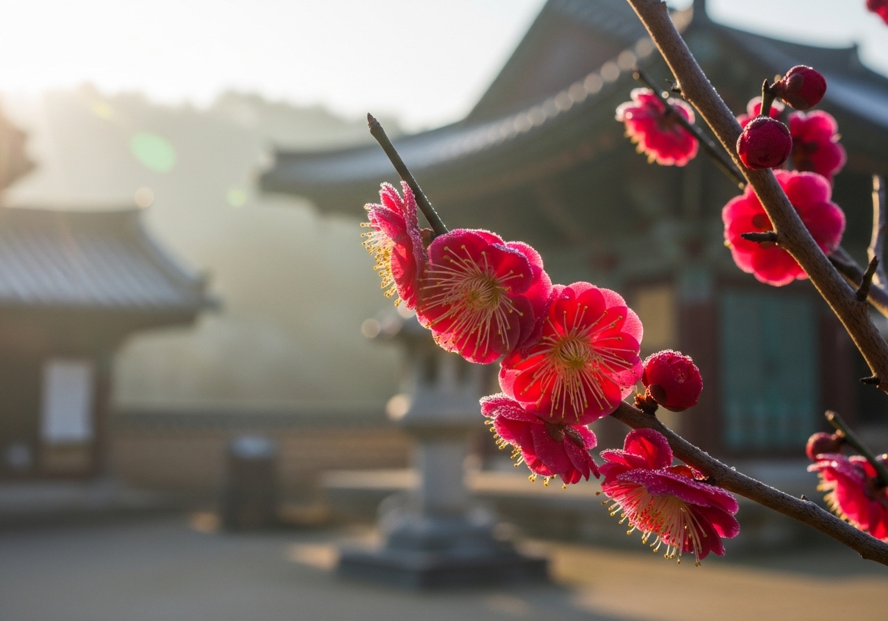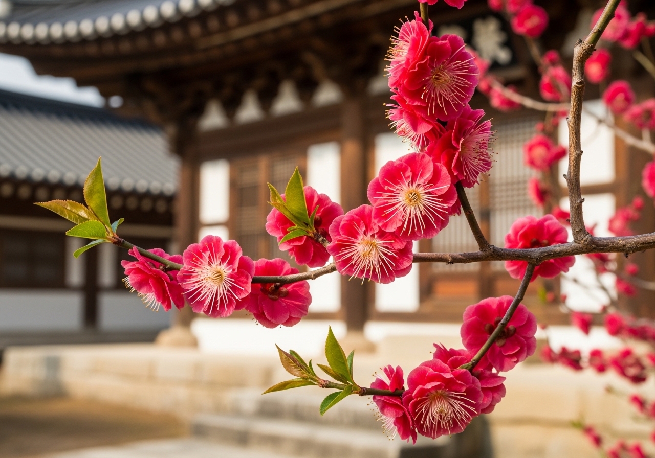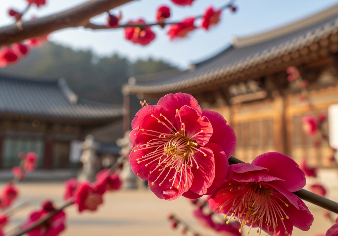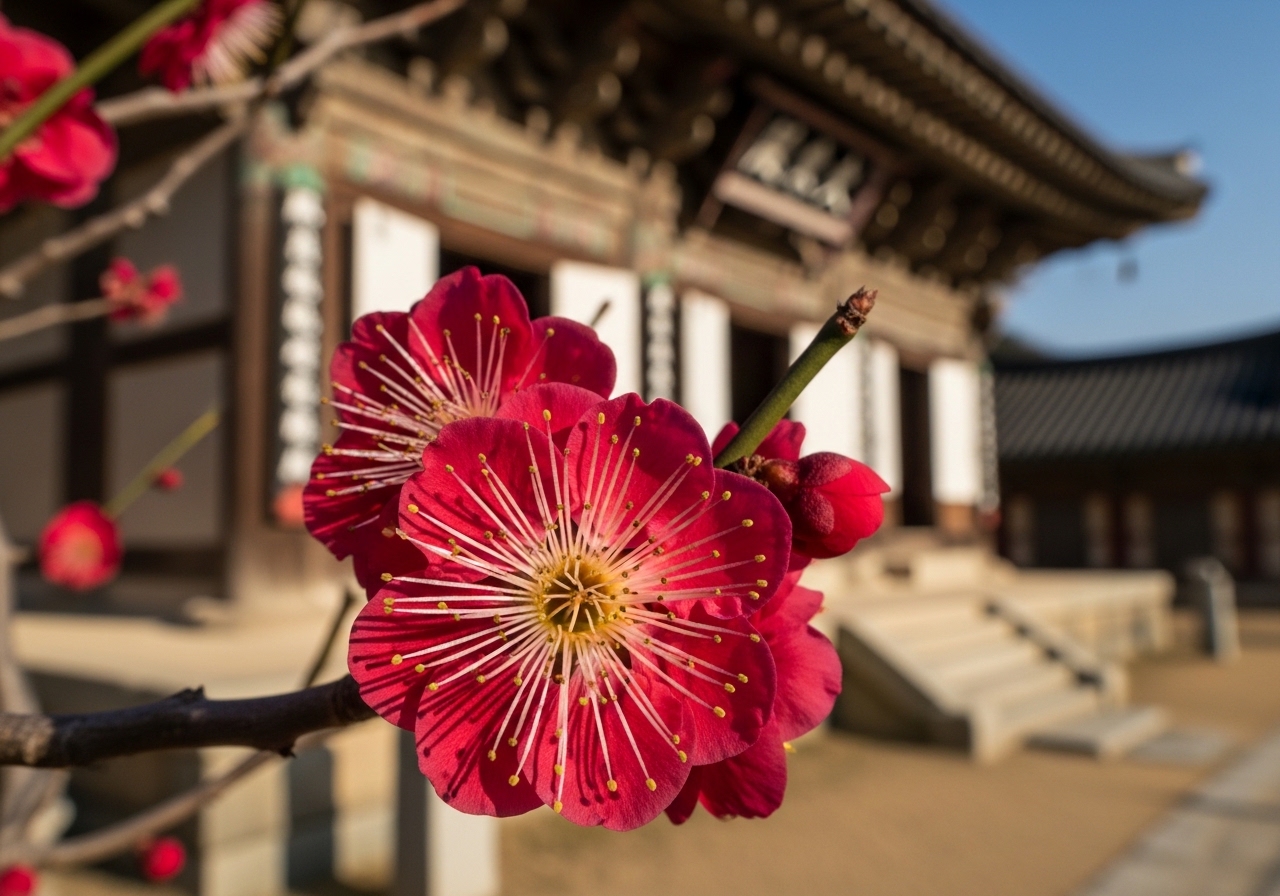 - 배경 활용: 고찰의 고풍스러운 건축물이나 푸른 하늘을 배경으로 담으면 홍매화의 붉은 색이 더욱 살아납니다.