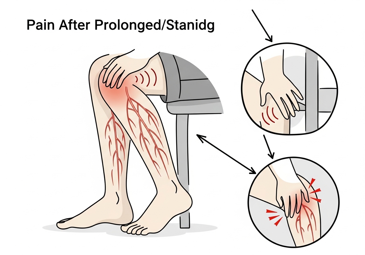 찌릿찌릿하거나 콕콕 쑤시는 듯한 통증, 혹은 욱신거리는 통증이 다리 전반에 걸쳐 나타날 수 있습니다. 특히 활동량이 많았던 날 저녁이나 밤에 더욱 심해지는 경향이 있습니다.