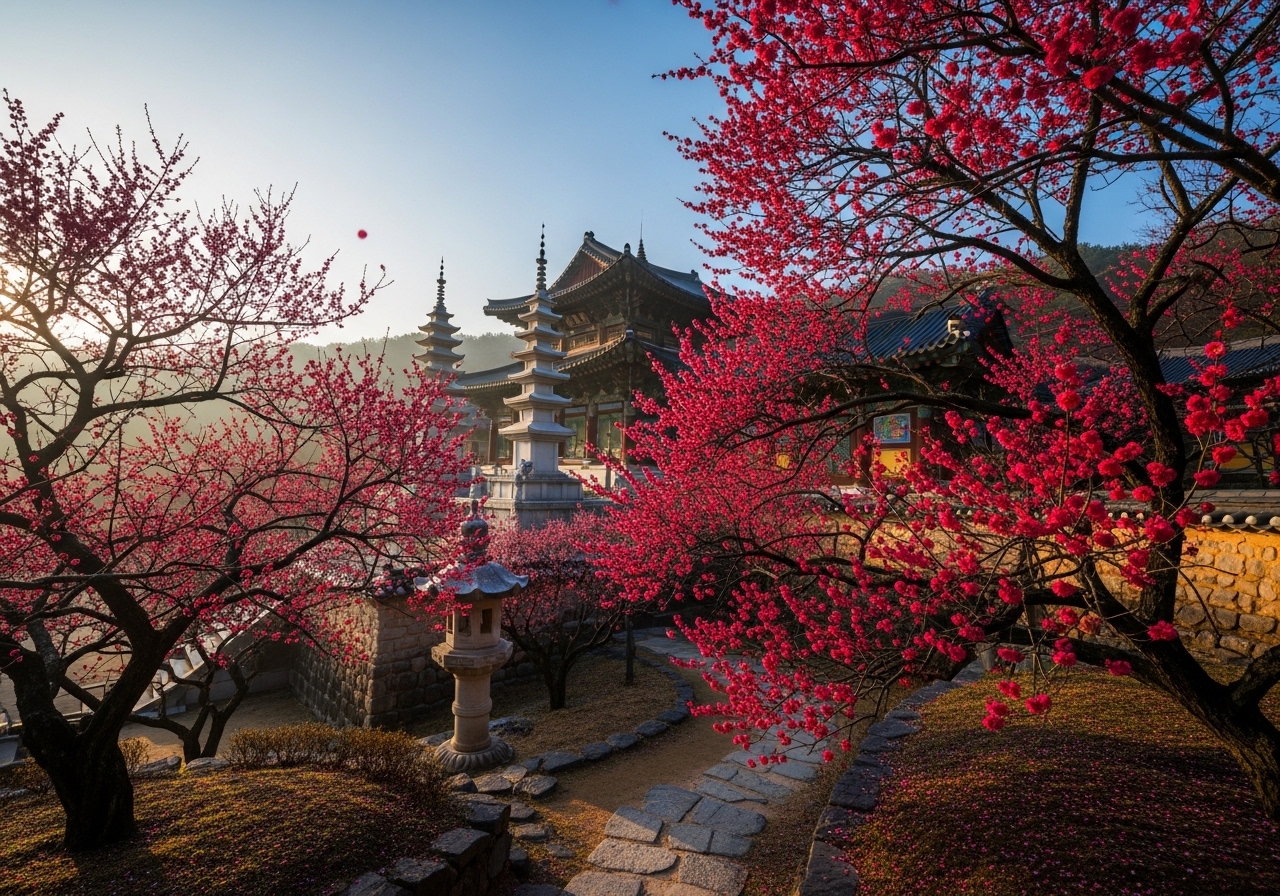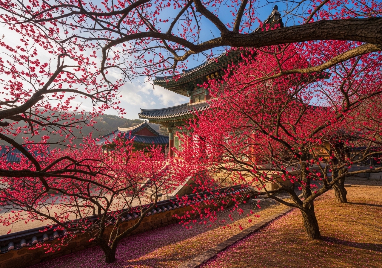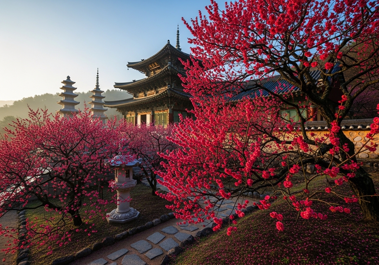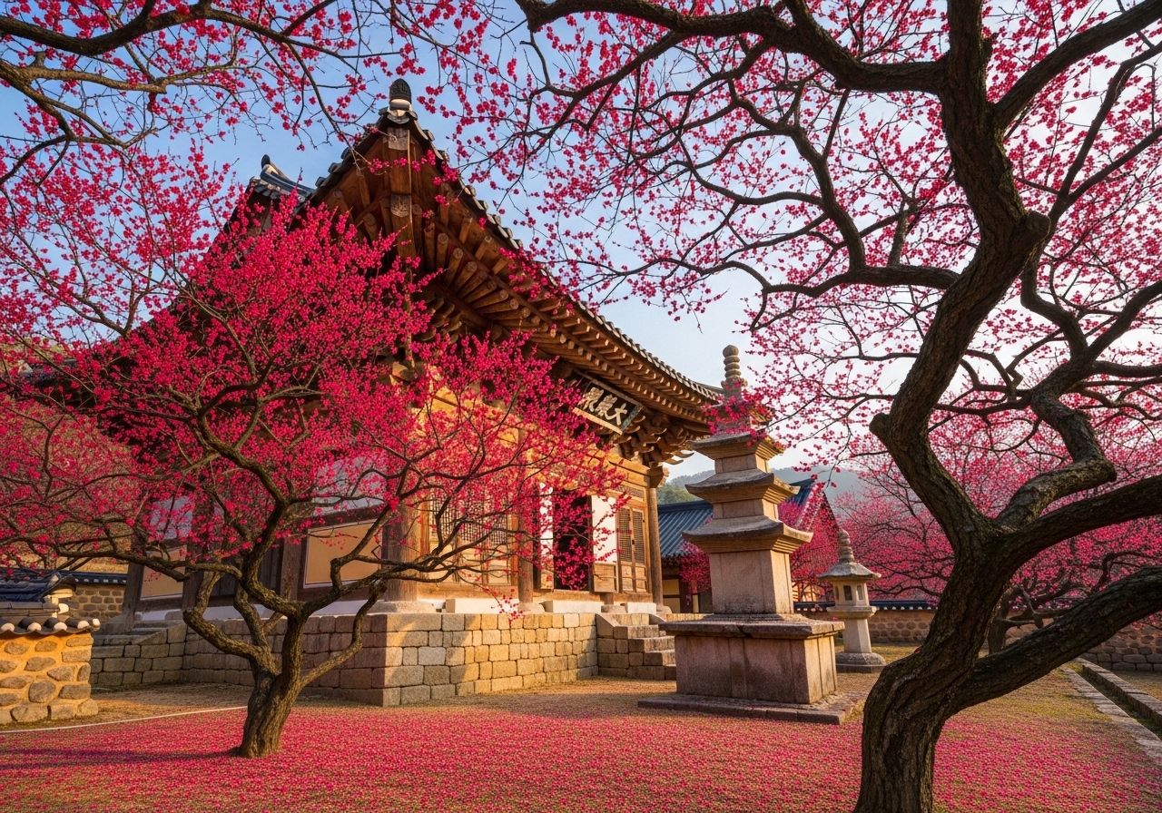 • 대웅전 주변 및 사찰 곳곳: 화엄사 경내를 천천히 거닐다 보면 대웅전 주변이나 계단 옆 등 예상치 못한 곳에서 아름다운 홍매화를 발견할 수 있습니다. 다양한 각도와 배경을 활용하여 나만의 특별한 매화 사진을 만들어보는 즐거움을 느껴보세요.